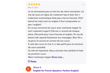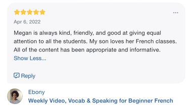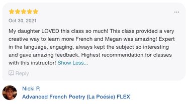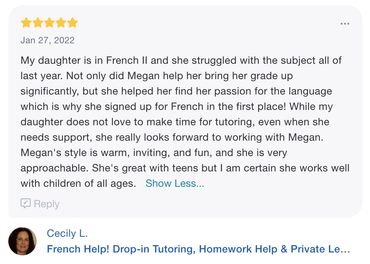 "Megan and her team worked with two of my high school aged children over the last several years. We specifically needed teachers who could assist them with a higher level French - but not quite fluency. Their tailored and custom approached helped my kids get exactly what they needed. If you're a parent with kids who fall in the middle of the spectrum and really need support getting them past the plateau, I can highly recommend."